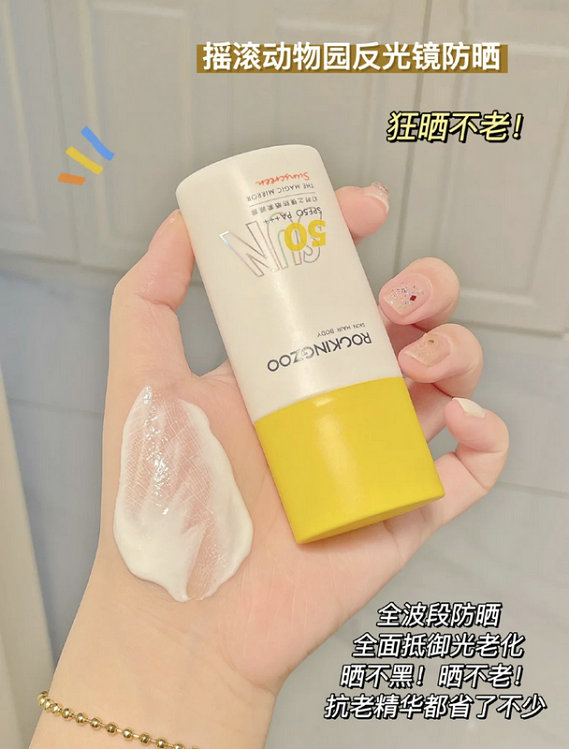 摇滚动物园防晒霜成分安全,不含酒精,成膜快,防水防汗。涂上之后是很自然的水光肌,不会假白或者是泛油光,就算是油皮用也挺清爽的,而且之后继续涂粉底液也不会出现搓泥的现象。