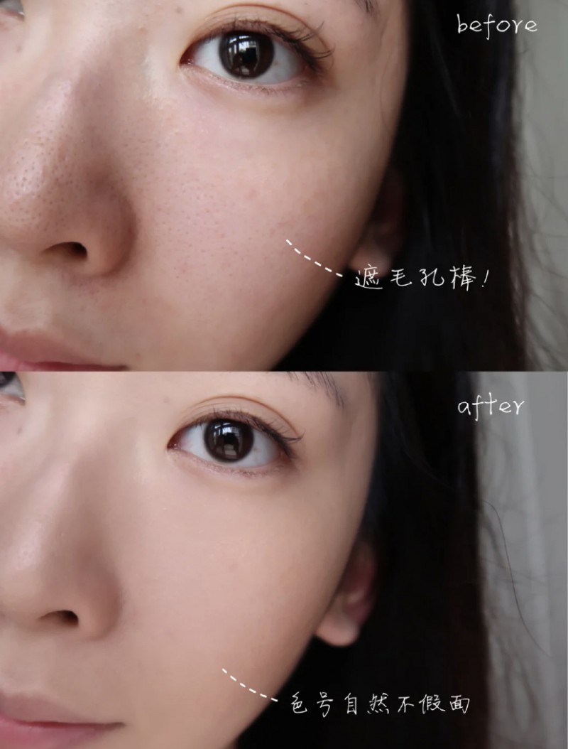 让我惊喜的地方是,这款粉底遮毛孔特!别!牛!我毛孔粗大超严重遇有很多粉底液都不好遮住,但这款上了一层竟然都遮住了西。遮毛孔是真的强!喜这点我要吹爆!