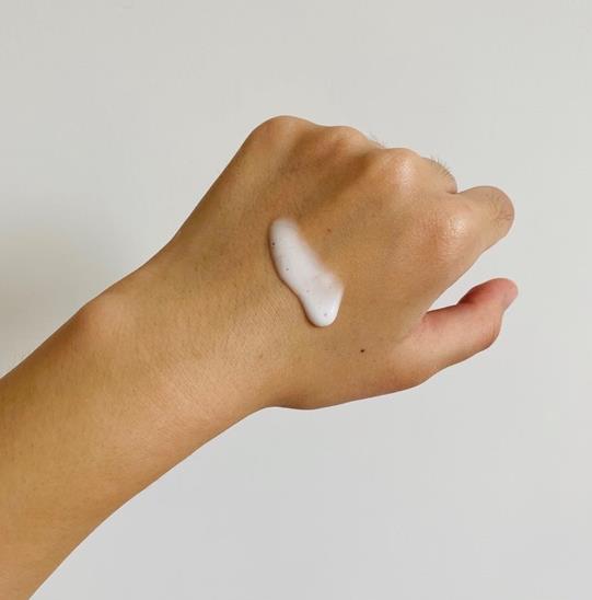 带有一点淡淡的清香,非常好闻。轻轻推开后会看到,白色的乳液里面带有一点闪闪的粉红色,我估计应该是红景天的成分,特别好推开,很丝滑,延展性也很棒!