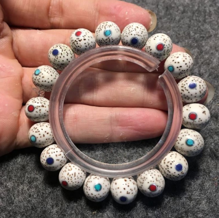 1、菩提根不是树根,而是一种叫做贝叶棕的种子,表面粗糙有花纹,里面是白色的。经过长时期的盘玩会变成黄褐色。是制作念珠的佳品。菩提根打磨后,遇水会产生酸酸的味道,随着盘玩包浆,味道会逐渐消失。