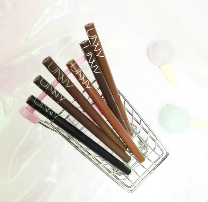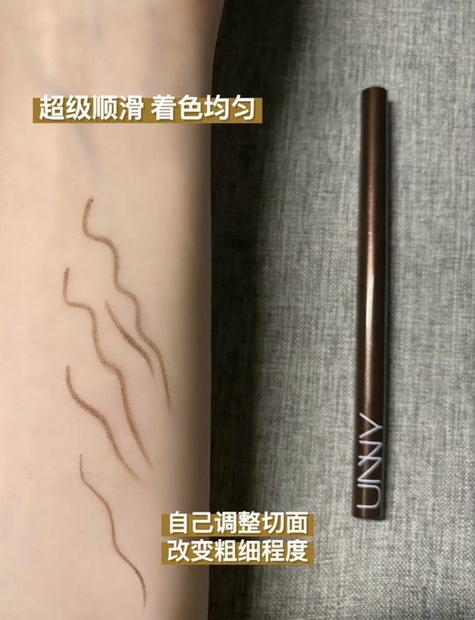 unny眼线胶笔是自动旋转笔头,笔芯非常的柔软细腻,一笔上妆,非常的温和,不会扎眼,不易手抖,非常的流畅,它有6个色号,像我们日常使用选择自然棕就行了,自然柔和的棕色,能轻松驾驭淡妆还裸妆,能持久不晕染,一整天下来都不会有问题,新手也能掌握住用量,显色自然。