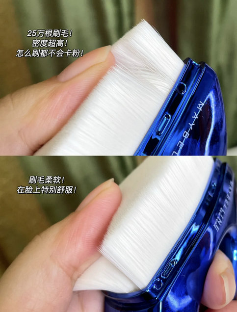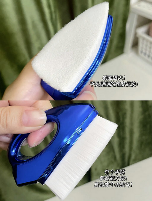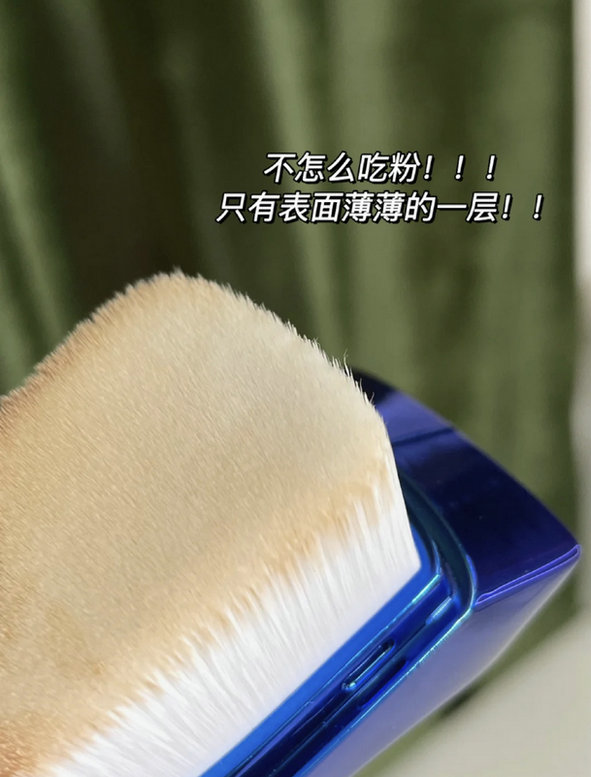 真的好好用,完全没有一根一根的毛的感觉。如果是普通的粉底用手拍开再刷就不会吃粉,甚至我觉得不需要用粉扑再压一下了。好像在用一块柔软的布擦脸,特别服帖,真的不错,蓝色很好看很酷,把手设计也符合人体工学,还有盖子,很好很好很好!推荐入手!