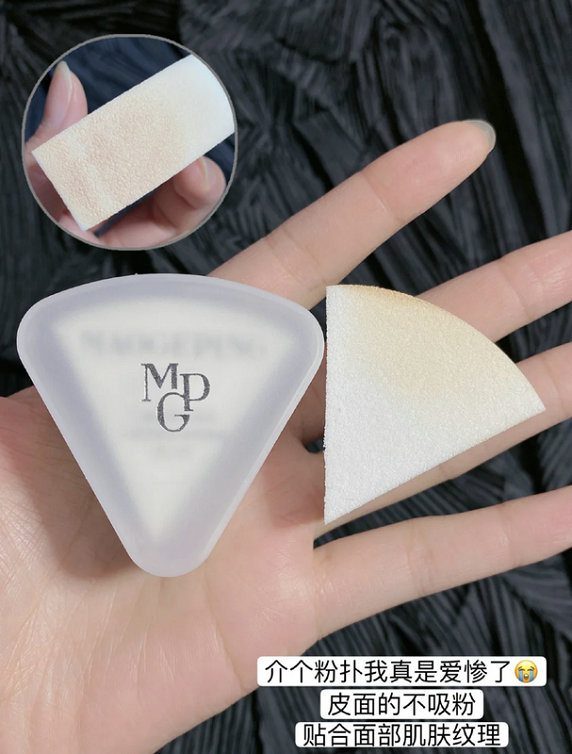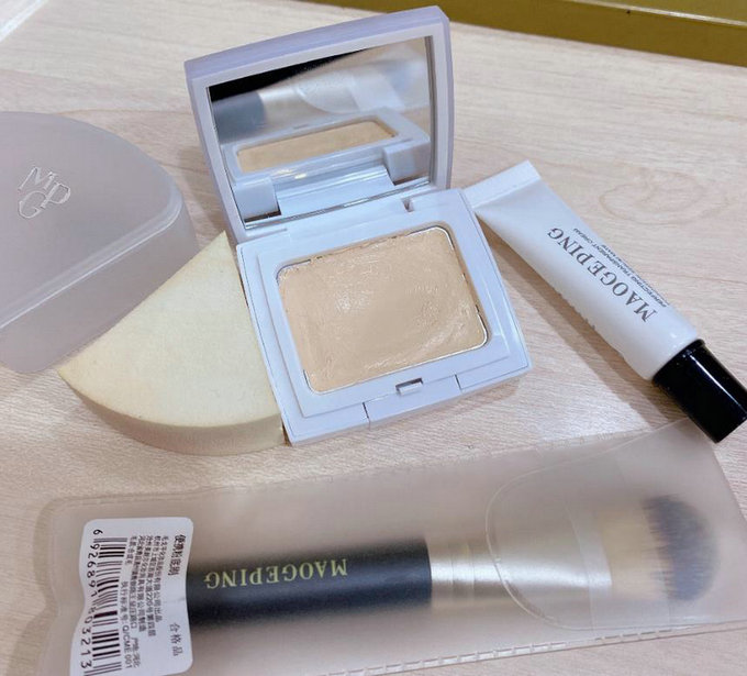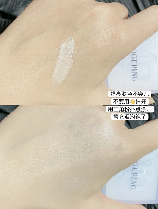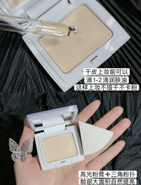 使用前可以在膏体上滴1-2滴润肤油,干皮宝宝试试~后续上妆不卡粉三角粉扑适合全脸大面积提亮,苹果肌那块轻轻拍几下就砰起来了~用细节遮瑕刷少量多次蘸取高光粉膏,遮盖黑眼圈泪沟处阔以多叠加一层!