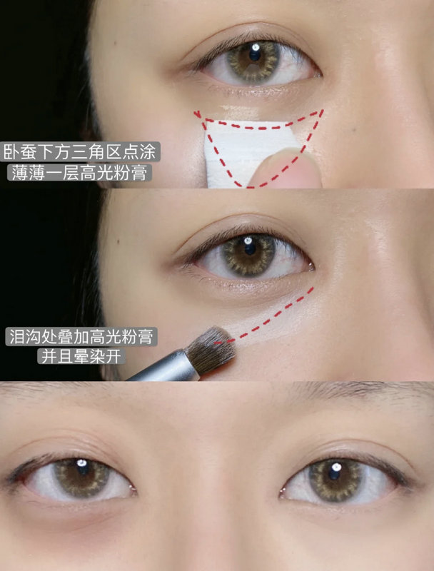 用三角粉扑的弧面去上妆而不是用尖头,为了让妆容更自然试试在粉底前上粉膏会比粉底后更自然。黑眼圈跟我一样不是很严重的,可以使试试。如果黑眼圈比较深建议用调色遮瑕膏+高光粉膏来搭配遮盖效果会更好一些!