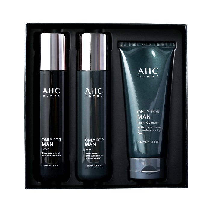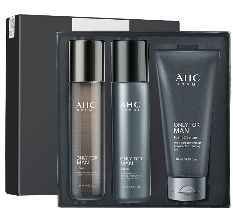 AHC男士水乳三件套是专为忙碌男士打造的肌肤能量补给液,帮助肌肤调整回充满活力的状态。它质地轻薄易吸收,帮助男士修护粗糙、肤色不匀、毛孔粗大等多重肌肤问题。