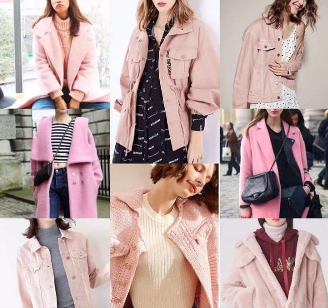 5、粉色外套+粉色内搭(同色系) 粉色有很多种,所以利用同色系深浅不同、明度不同,做叠穿搭配,粉色和粉色的组合,也是非常棒的。