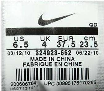 耐克运动鞋型号,可以通过鞋标、鞋盒贴纸、合格证等地方来识别。使用的格式为6位系列号+3位颜色号,比如315115-112,这个就是鞋子型号。尺码可以通过鞋标和鞋盒贴纸进行查询,耐克运动鞋有US、UK、EUR、CM四个尺码单位,国内是参考EUR尺码,如下图所示:
