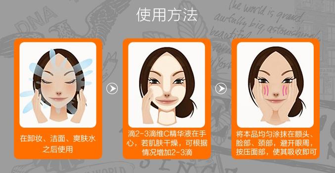 每日早晚洁面之后使用,每次可以取三颗绿豆大小的维C精华于3个手指指尖,手指略微揉搓之后,可以以打圈的方式均匀涂抹在脸上。为达到最佳的功效,建议使用在脸部,颈部及前胸部位。这款维C精华乳液浓度高达12.5%,分别是10.5%的精纯左旋VC和2% 的VCg。精华乳中的精纯左旋VC会立即作用于肌肤,进行抗氧化,而VCg则负责延长效果。