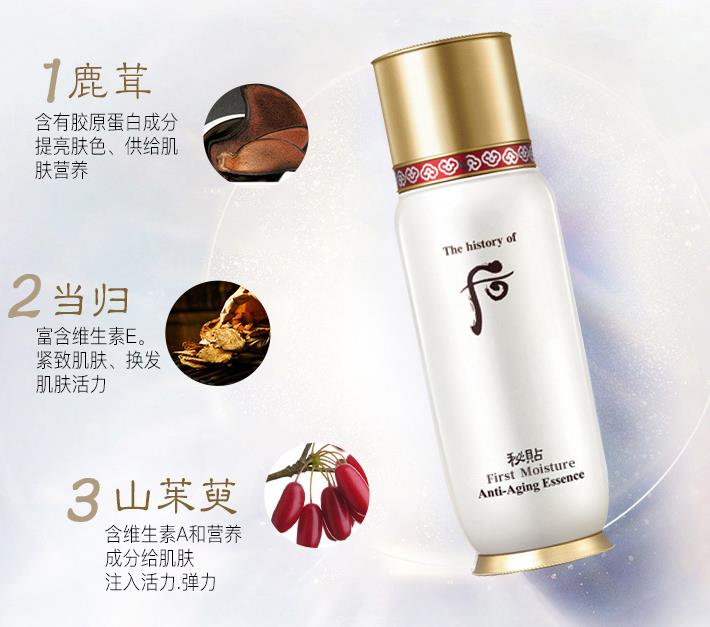为了使精华更深入吸收,先以Whoo后调理水润泽调理肌底,再使用本产品。取适量以脸、鼻、下巴的顺序,按皮肤纹理方向均匀涂抹,并以手指轻轻拍打帮助完全吸收。