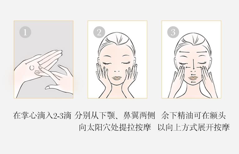 1. 使用方法:在清洁完肌肤以后使用,每次大概2-3滴就可以,滴在手掌上然后双手合并温热一下,在轻柔的按压在脸部,配合一下按摩的手法更好,当然还可以将精油滴几滴在我们日常用的化妆水呀、乳液之类里,这样混合使用同样可以使肌肤更有光泽哦~