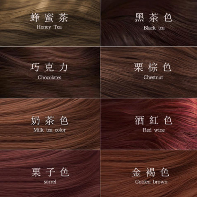 雾茶棕,有点红色调的棕色,颜色在棕色中算是比较亮的,也很有光泽感,配长卷发超级温柔!黑黄皮也适合的一款发色。