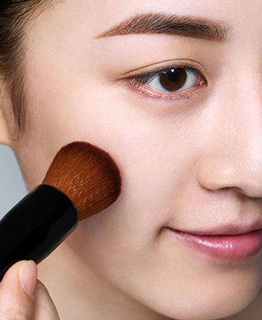 (4)想要让脸型看起来显瘦,可以在脸颊侧画腮红,因为脸颊侧和发际线相连。可以选择颜色较深的腮红,例如砖红色。用腮红刷刷在脸颊外围侧边,多加晕染自然让其融合就好。