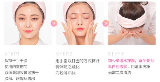 等按摩到一定阶段,就需要沾取适量的清水在手上,然后再继续轻轻地按摩。这个时候,就会发现自己脸上的卸妆膏变成了白色的乳液,可以看出来进入了乳化阶段。因为卸妆膏或者是卸妆油都是利用油去除彩妆的方式,只有乳化得到一个比较好的效果,才能够有效地去除残留在脸上的妆容。因此,这一阶段,我们需要重视起来。