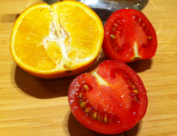 3,将西红柿、橙子各取一半放进榨汁机中,榨取汁液。