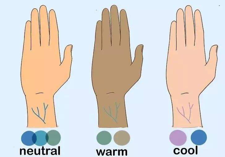 血管法:如果你看你手腕处的血管,发现是蓝色或者紫色,那么你属于冷调皮肤;如果你发现是绿色或者橄榄色,那么你属于暖调皮肤;如果两种都有,或者你不好判断,那么你选自然色调就一定不会出错。
