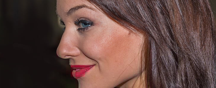 5、长型脸画腮红需要在鼻翼上确定一条横线,然后再用腮红在这个横线区域内刷画,可以缩短脸型的长度,不但可以提升气色而且还能显得年轻。