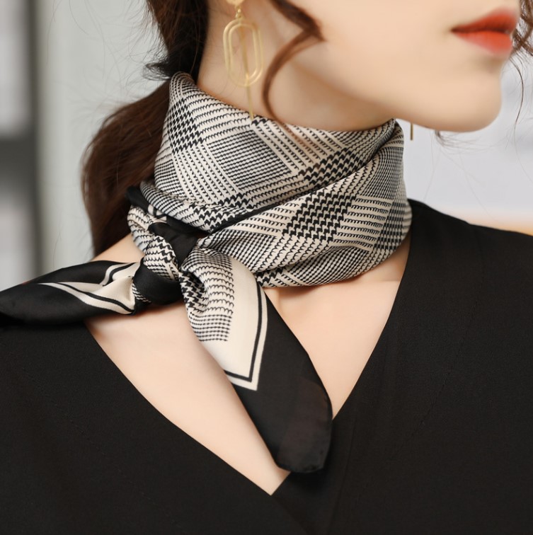2.第2种方法是把正方形围巾折叠成长方形,然后在脖子上绕一圈,这是一种非常常见的系带方法。