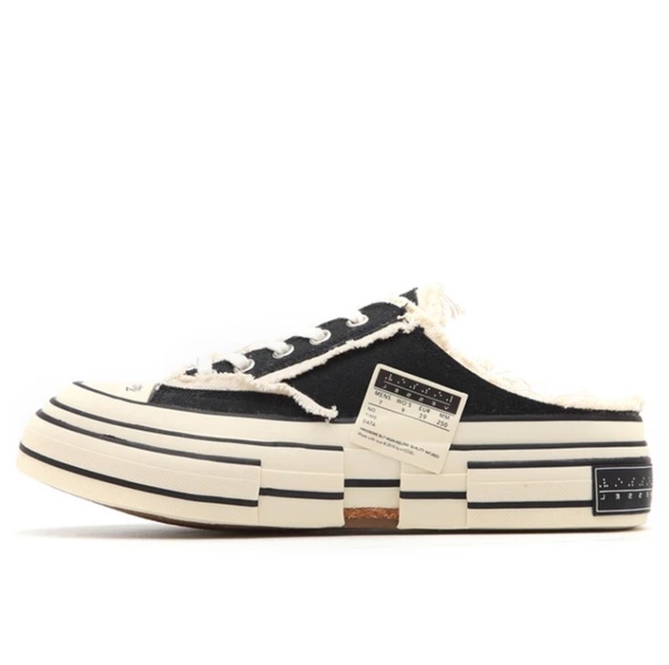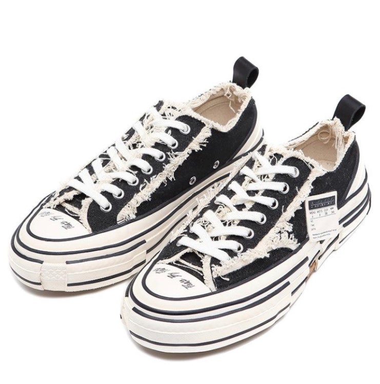 最近,xVESSEL 新推出的毛边帆布鞋更是被余文乐陈建州等一众明星好友收入囊中,连 WIND AND SEA 的主创熊谷隆志都赞不绝口。羡慕之余,这双鞋也终于有了清晰近照。从图上来看,这款低帮鞋采用黑色毛边的帆布制成,多层拼贴的边条和年初王逢陈 x 匡威的秀场款如出一辙,甚至还露出了木质中层。橡胶的尺码牌同样以解构的方式随意附着在鞋外,而鞋头 “peace by piece” 的手写字更是抖出机灵点明核心。整体设计可以说是非常用心了。