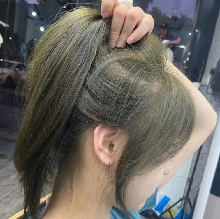 4、冲至浅金后,用漂粉+3%双氧+1/40的紫色+9/11=目标色灰。