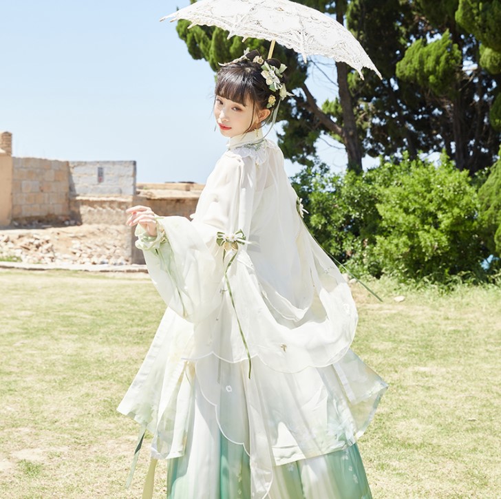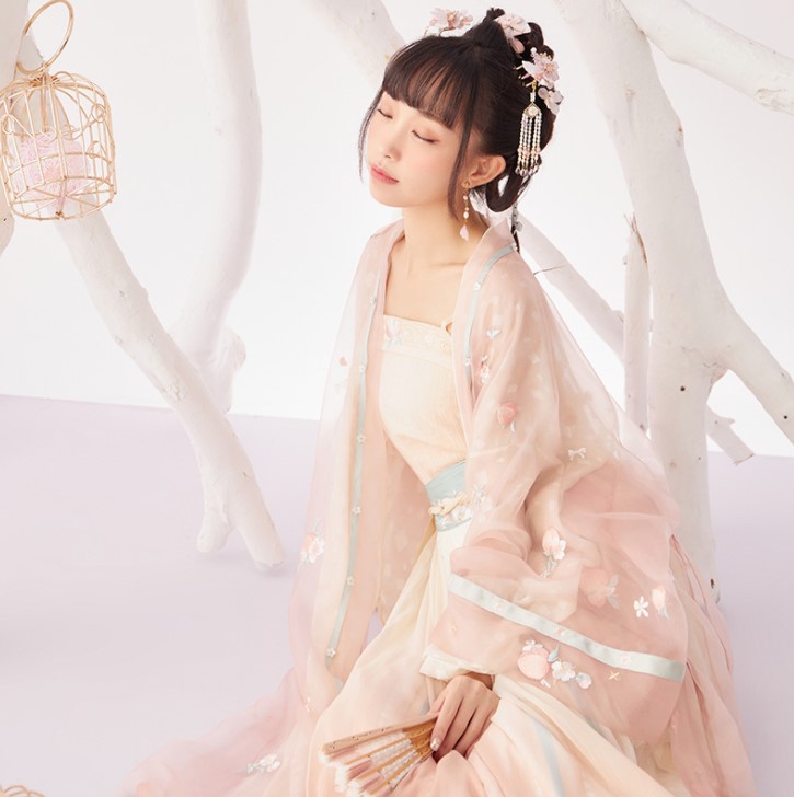 “襦裙”是汉服中的一种制式,在隋唐时期妇女们的裙子系的都比较高,在胸的位置上,所以这类襦裙又被称作是齐胸襦裙。齐胸襦裙在唐代的仕女图中非常常见,一般颜色都很艳丽展现大国风采,而齐胸襦裙也能表现出大唐开放的国风。