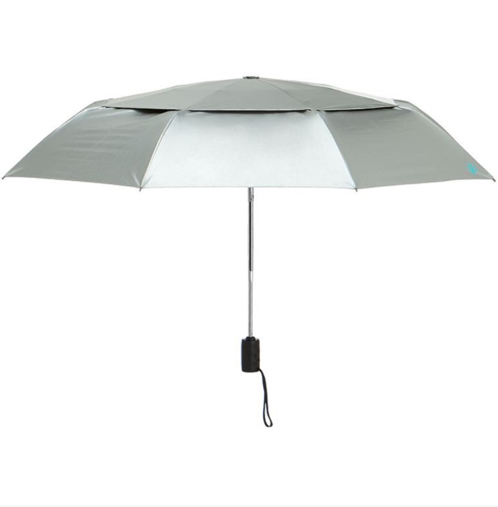 Coolibar采用的是目前世界上醉先进的超薄钛金属无涂层伞布,跟传统的黑胶伞布不是一个概念。黑胶伞防紫外线是简单粗暴的靠厚厚的涂层来隔绝一切光线,透不透光不是衡量一把防紫外线伞的好坏。好的涂胶伞防紫外线效果也是能达到UPF50+的,但缺点是涂层耐久性不好,用久了或许遇水都会存在涂层脱落的问题。还有就是伞布很厚,聚热效应很强,夏天撑着就像头顶有个火炉。Coolibar伞面的耐久性非常好,超薄的伞布能降低聚热效应,再加上专利双顶篷通风系统,让头顶散热通气,不燥热。下雨天也可以用,伞布本身防水,晴雨两用。因为不是涂胶伞,不存在像黑胶伞遇水防晒涂层会脱落的情况。Coolibar防紫外线是靠伞布本身融合的二氧化钛,不是靠银胶黑胶涂层。