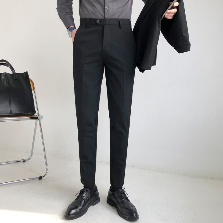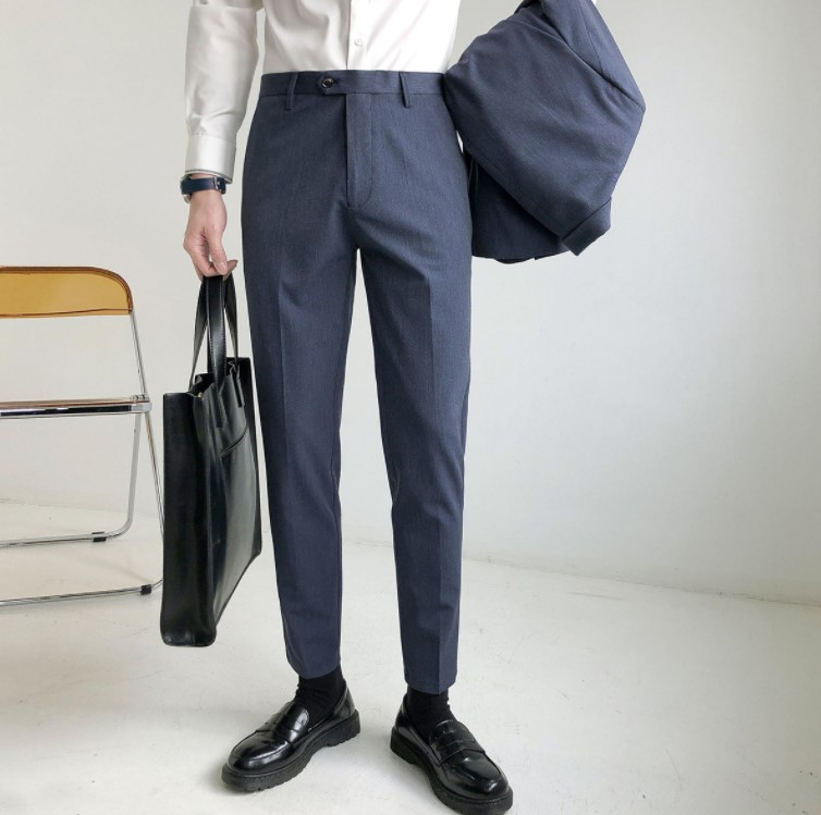 在穿正装的时候,你的版型很重要,如果是相对于壮一点的男士来说,就需要买的稍微大一点穿好看一些,裤脚的位置也不要很长,差不多到鞋子的位置就可以了,太宽松的话就显的不够正式了。