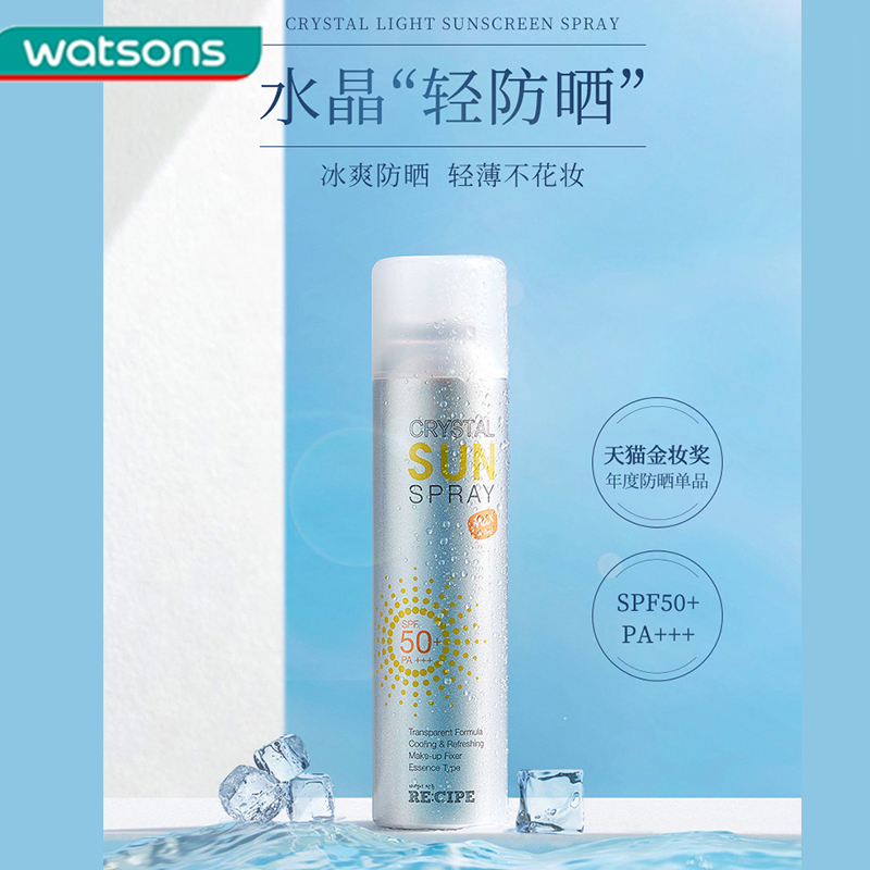 屈臣氏RECIPE玥之秘水晶防晒喷雾150ml SPF50+是屈臣氏的一款水晶喷雾,其使用方法如下:使用方法: