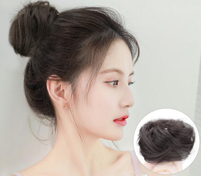 方法二:先从头发前面取一小部分头发扎起来,然后再将剩余的头发扎起来,扎不上的短头发会自动垂下。然后将第一个辫子从中间自上而下穿过,接着再将第二个辫子从下面穿过第一个辫子,最后你再将其装饰一下,绑成丸子头,就完成半丸子头了。