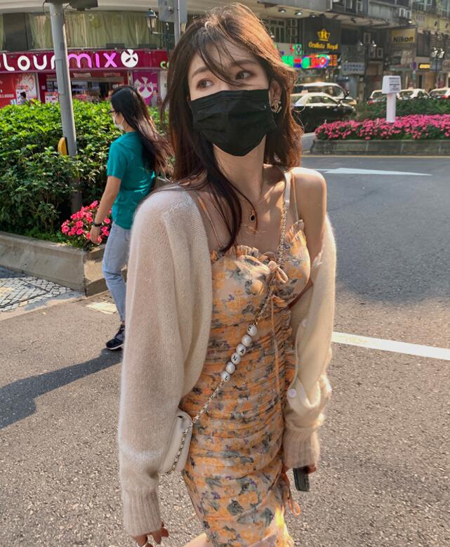 亮丽的糖果色,凸显甜美俏皮的感觉;修身的短款针织开衫,百搭又防晒,搭配吊带背心,十分合适。