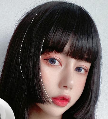 然后以头顶和左右两个眼角构成的三角形将刘海分开,然后确定刘海的宽度。如果能够保持刘海左右的宽度比较宽的话,会显得更加俏皮可爱。