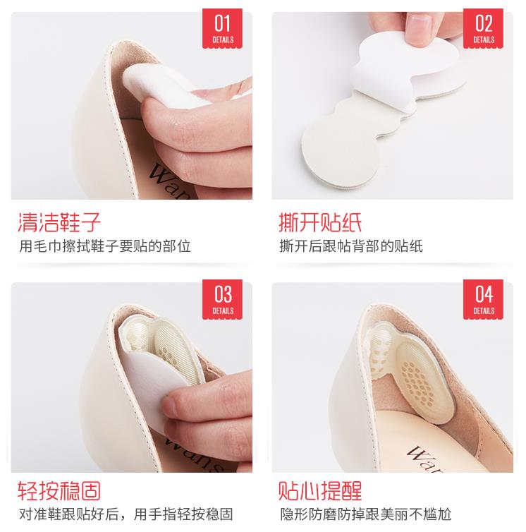注意贴的位置,后跟帖不要超过鞋子本身的后跟边缘,要低于后鞋帮,不然很容易掉落而且脚感觉很不舒服。