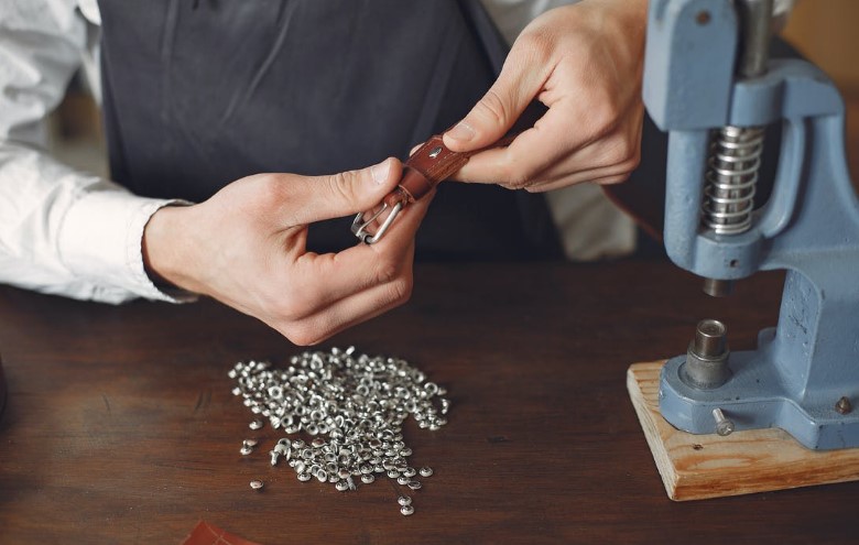 1.金属纽扣一般分为扣面和钉子两部分,外面先拿出扣面,为防止扣面损伤,可以先在桌面上放一块厚实一点的布,然后扣面一面贴着桌面上的布面。这时扣面的脚是朝上的,然后需要订扣子的牛仔裤位置套到扣面的脚上。