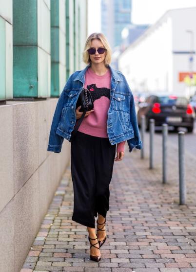 3. 短款牛仔外套、黑色阔腿裤穿搭