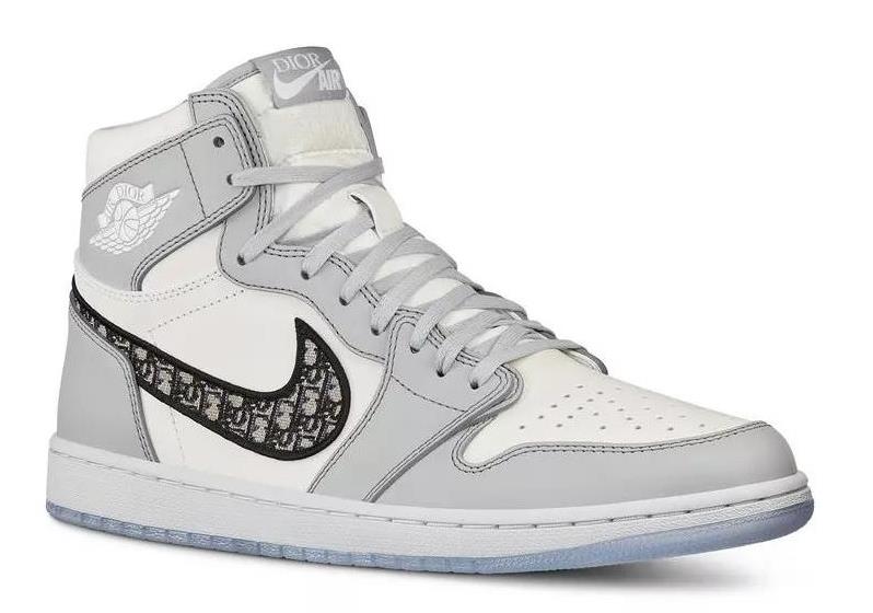 Dior x Air Jordan 1联名鞋款的鞋面以乳白色和浅灰色为主调,侧面 Swoosh 以 Dior 经典的满印老花帆布打造,鞋帮上的经典飞翼改为 “AIR DIOR” 字样彰显联名身份。整个鞋舌则使用纯白色的满印老花帆布,同时附带有 Jumpman Logo 和飞翼 Logo 两块金属吊牌。最后搭载冰蓝色半透明水晶外底,左右就还分别透出 “DIOR” 字样与飞翼 Logo。