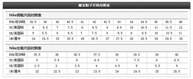 以上分享的关于耐克鞋子尺码对照表的介绍,以及其他相关内容的分享,大家可以作为参考建议,具体根据自己的鞋子尺码大小进行选择,对于以上问题我们就介绍到这里。希望可以帮助大家。