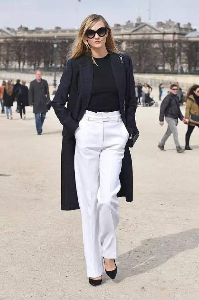 2、白色裤子。蓝色上衣搭配白色裤子十分清新优雅,尤其是搭配一条白色的阔腿裤,更能轻松搭出潮人气质。