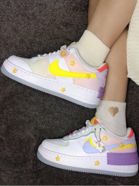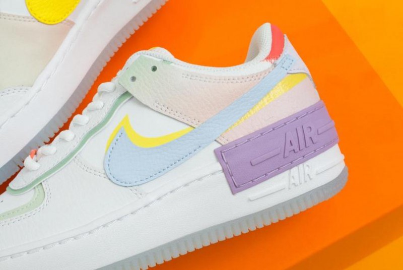 马卡龙配色是一双很青春洋溢的糖果色空军,以Air Force 1 Low 鞋款为原型进行打造,一款配色以白色为主调,则采用多色彩拼接,呈现出丰富的层次感;女子运动鞋为经典设计注入玩味元素; 采用了分层结构、加大了中底及双重品牌标志。