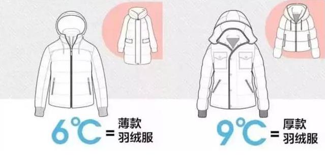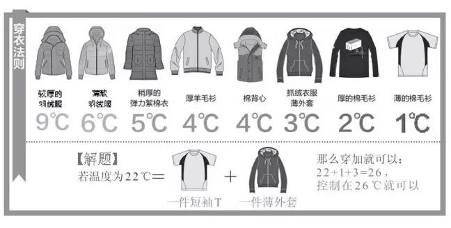 较厚的羽绒服相当于9℃,薄款羽绒服6℃,稍厚的弹力絮棉衣5℃,厚羊毛衫是4℃棉背心4℃ 抓绒衣服,薄外套是3℃ 后的棉衣衫是2℃ 薄的棉毛衫是1℃,穿衣公式:环境温度+衣物对应温度=26,例如:环境22℃,穿一件短袖加一件薄外套:22+1+3=26