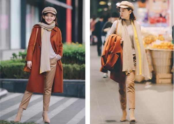 【搭配Look1】:毛衣+阔腿裤 毛呢大衣内搭毛衣+阔腿裤,这样的组合在秋冬季节可是最受青睐了,杏色中长款毛呢大衣,加厚面料,穿在身上很保暖,温柔大气的杏色,不仅显肤白还时髦,脚下可以选择一双帆布鞋或小白鞋,休闲感十足。