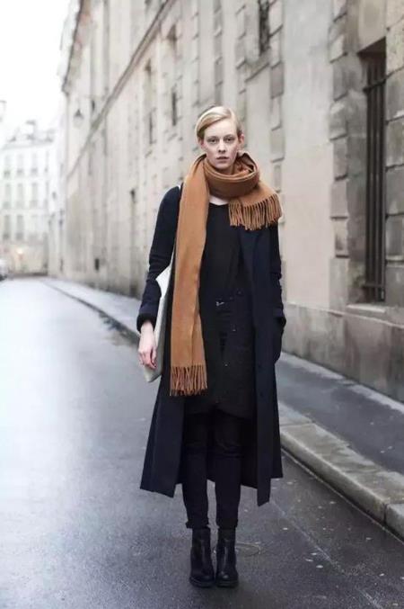 3、本身黑色衣服也很白搭的。黑色搭配浅色系围巾显得精神大方,搭配深色系的围巾显得时尚洋气。