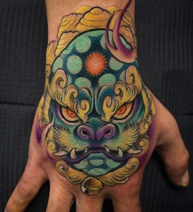 唐狮子这是一种东方神话中的动物。特别是在东南亚,唐狮子是被当作佛教圣物来崇拜的,它被认为是万兽之王,在庙宇和神殿的门口都会摆放上一对石狮子,作为辟邪镇宝守卫之用。在典型的日式纹身中,唐狮子图案几乎毫无例外的配以牡丹花,因为牡丹花也同样被认为是百花之王。在一个纹身图案中纳入两个王者象征,是为了表达一种至高无上的王权力量。当今,有很多刺青师会在自己的刺青作品中溶入东西方两种风格,所以唐狮子也越来越多的出现在欧美的纹身图案中。虽然在中国神话中这种造型的动物被认为是狮子,但是在北美,人们还是习惯把它称为“福犬”。
