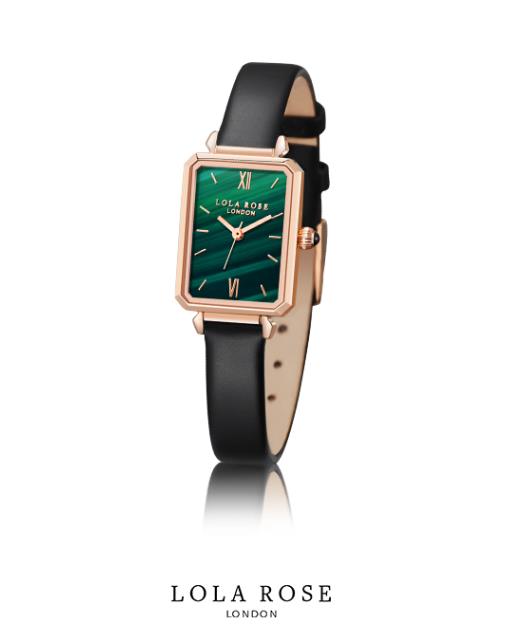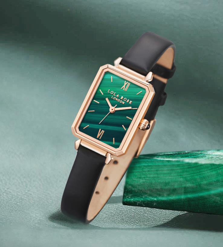 lola rose 属于1000元左右价位段的时装类腕表。其中最火的就是小绿表。Lola Rose手表属于英国的小众品牌,目前刚刚进入中国市场还没有中文名字,翻译成中文是罗拉玫瑰的意思 Lola Rose手表经典款就是下图的这款小绿表了。做工很精致,表盘上有很好看的孔雀石纹理。表冠上还镶嵌了一颗黑色的玛瑙,黑色牛皮表带,非常的适合女孩佩戴,作为穿搭的时尚腕表,戴起来优雅神秘又有气质。细表带让手腕看起来很纤细。比较适用于年轻时尚的人群,很吸引众人眼光。