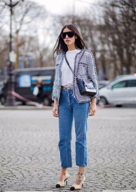 米白色小香风外套是比较受欢迎的一款,搭配一件白色T恤,下身搭配一条蓝色九分裤,简约、大方国际范儿。