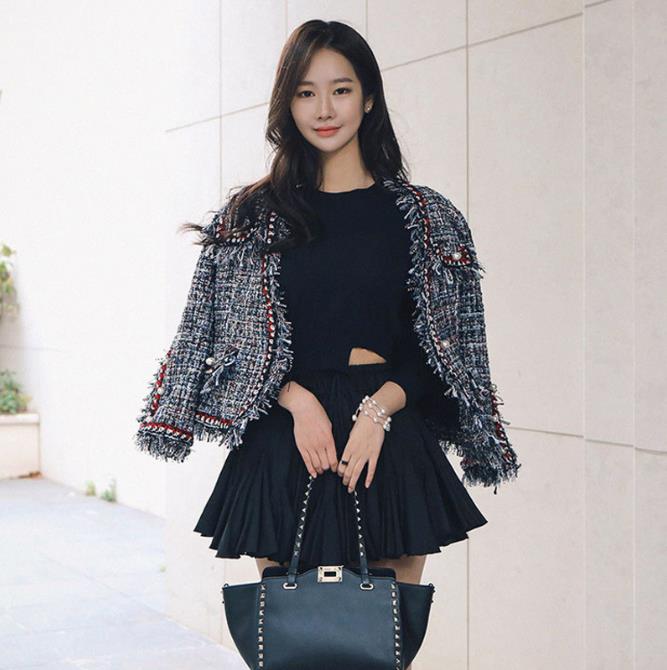 1. 小香风外套自带优雅属性,尤其是短外套搭配甜美的黑色简约连衣裙,不仅给人呈现出乖巧的感觉,还能减龄显青春活泼。