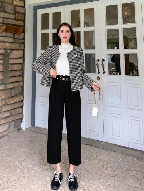 5. 小香风短外套无论在什么季节,搭配女生的必备单品铅笔裤都是适合的,铅笔裤不仅百搭,还非常显瘦,尤其是搭配小香风短外套更是丝毫不违和的。无论是有领子或者无领子的小香风短外套,最简单最方便的方式就是内搭一件白色打底衫,露出白色内衣展现简约感,配上九分铅笔紧身裤更加展现出整体服装的简明出彩。