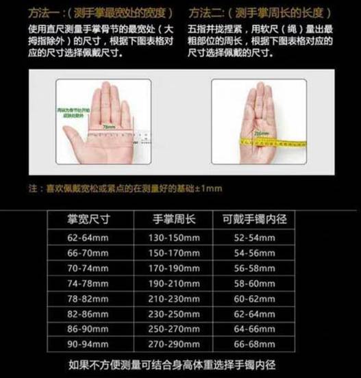 软尺测量法不是很准确,误差较大,但在条件不允许的情况下也是一个不错的选择。(如下图所示)把手自然放平,不要绷紧, 用一根线围手掌最宽处的周长和手腕最细处的周长,量的时候如果手很软的女士可以量紧点,手骨偏硬的可以量到刚好把线拉紧的程度即可。量出线的长度,除0.314,即是适合你的手镯内圈直径。例如左手量出 16.8cm(168mm),除0.314后,即可确定适合配戴内圈53.5 mm的手镯。需要略松或略紧,前后可加减1-2cm,就是你的手寸实际大小,手镯的尺寸。