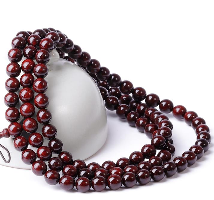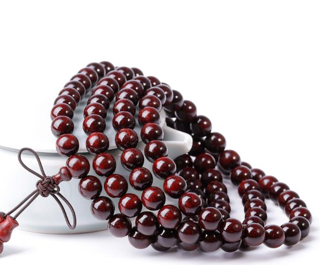 小叶紫檀木质含油量高,且木质密实,所以盘的时候不需要上油,可直接上手盘。先将手串表面的蜡层和污渍用搓澡巾擦去,每天反复擦拭两个约小时,坚持两天后,再用棉布盘搓一个星期,放置阴凉处自然干燥。干燥后,上手盘一两个星期,并且每天坚持盘三十分钟左右。 当手感觉珠子表面有粘阻感时,就证明手串表面的包浆已经形成了,再将其放置一两个星期。以上就是一个完整的盘手串流程,如此反复4-5次,手串便会变的很有灵气,甚至在阳光的照射下,出现反射光。