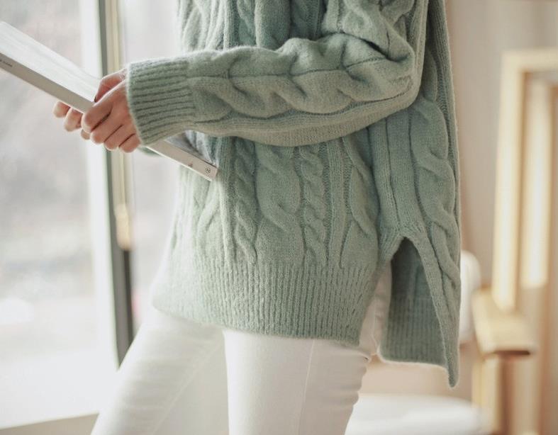 3. 中领宽松开叉毛衣 这件毛衣颜色非常的少女,领子的高度也适中,松紧合宜的下摆设计很到位。这样的开叉设计,可以将毛衣一角扎进仙气十足的裙子里,显得身材比例特别好。