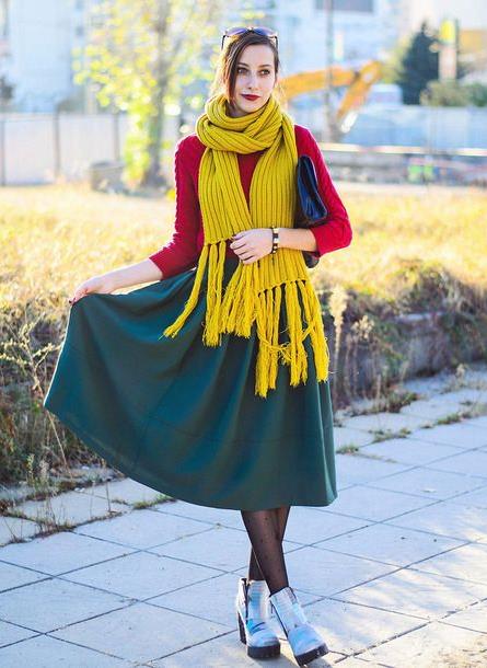 1. 斜肩式搭配将围巾展开来披在肩膀,用垂下的其中一端搭在另外一端的肩膀上,然后再将剩下的一端搭在另一个肩膀上,通过不对称的系搭方法可呈现出多面的时尚表情。