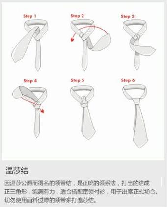 引起潮流的Windsor结是种非常英国式的漂亮领带结法。它体积大,因此适合系在分得很开的衣领上(例如意大利衣领)和很细的领带上。这种结要非常对称地打才能成功。操作起来有点复杂。